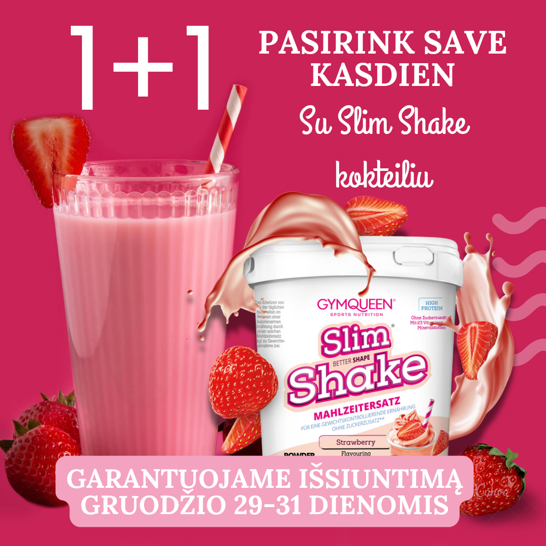 Kreminis ir ypač skanus „Slim Queen“ pusryčių, vakarienės ar užkandžio patiekalo pakeitimas kokteiliu palengvina jūsų svorio kontrolę ir svorio metimą. Paprasčiausiai pakeisdami vieną ar du patiekalus kreminiu ir ypač gardžiu „Slim Queen Shake“, sumažinsite kalorijų kiekį, taigi ir savo svorį, ir tuo pačiu aprūpinsite savo organizmą svarbiais vitaminais ir maistinėmis medžiagomis. Mesti svorį dar niekada nebuvo taip skanu! O geriausia: viena porcija turi TIK 250 kcal ir sudėtyje nėra jokio pridėtinio cukraus, sintetinių skonio stipriklių ir sintetinių konservantų. Kokteilio porciją paruošite per mažiau nei minutę – taigi niekas tikrai nesutrugdys siekti Jūsų norimo tikslo metant svorį, siekiant svajonių kūno.